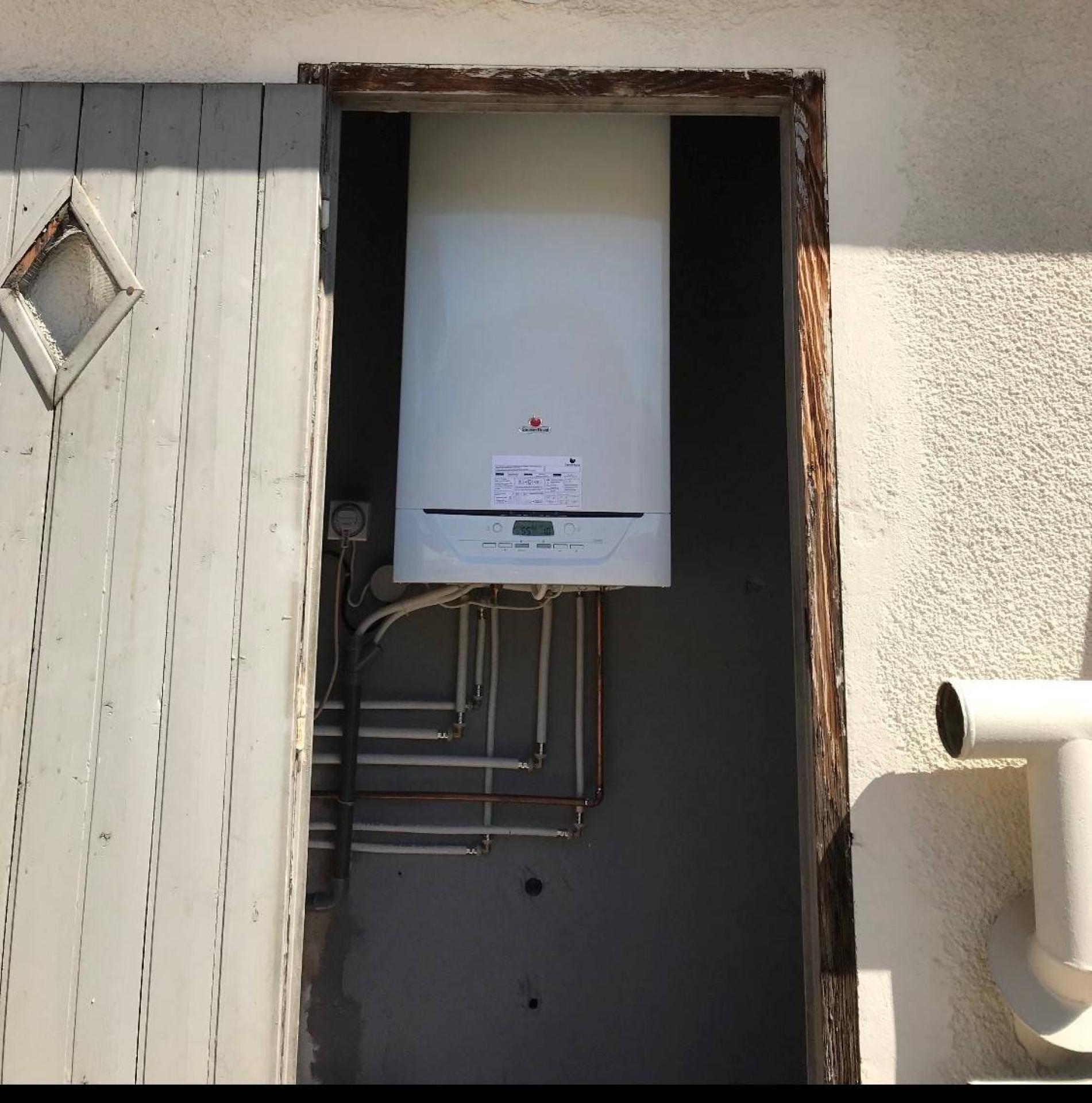 Ici sur la photo ci jointe, voici ici un exemple d’une de nos réalisations, avec la pose d’une chaudière à gaz de la marque SAUNIER DUVAL ISOMAX à condensation.
